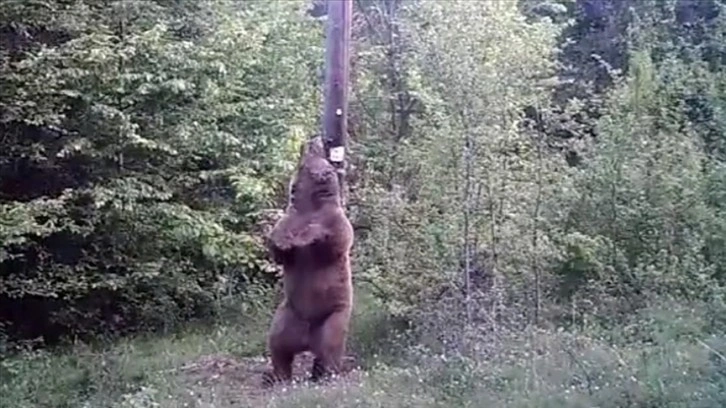 Milli parkta bir bozayının yiyecek araması ve elektrik direğinde sırtını kaşıması, fotokapan tarafından kaydedildi.