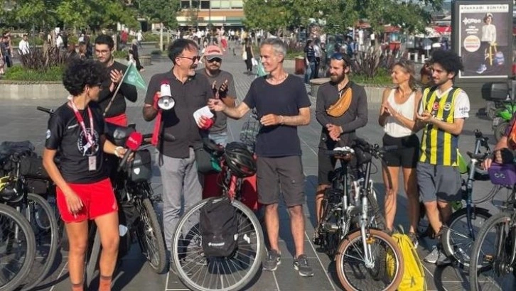 Fransa'nın başkenti Paris'ten bisikletle yola çıkan 3 iklim aktivisti, İstanbul'da bir grup bisikletsever tarafından Barbaros Meydanı'nda karşılandı. Burada konuşma yapan aktivist Guillaume Outrage, iklim değişikliğinin çözümü konusunda bisikletin önemini vurguladı.