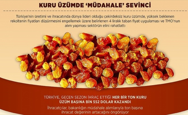 Türker, Türkiye'de üretilen çekirdeksiz kuru üzümün yüzde 15'ini alabildiklerini vurgulayarak, "Bizim payımız yüzde 15, bu yüzden piyasayı düzenleyecek bir gücümüz yok ancak TMO'nun kuru üzümde müdahale alımı sektör açısında tarihi bir olay. TMO, 4 lirayı açıklamasa ve alım yapmasa bu üzümün kilogramı 3 liraya kadar inecekti." ifadelerini kullandı.