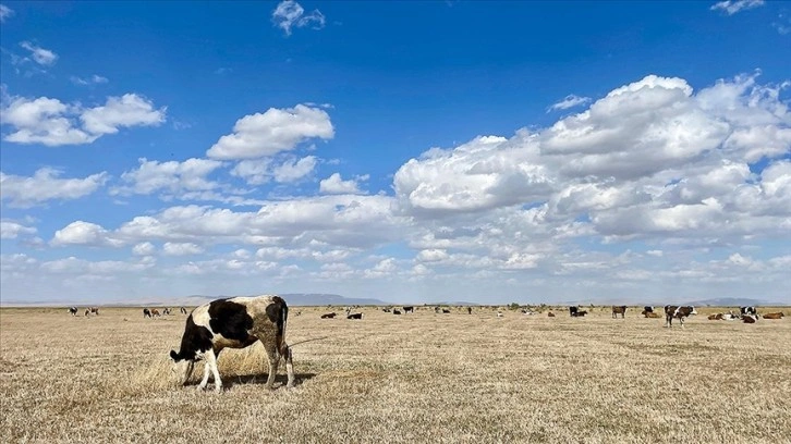 İlçenin Yeniköy Mahallesi'nde yaşayan 61 yaşındaki Mustafa Sakallı, içinde kendi hayvanlarının da olduğu 170 büyükbaşı kuruyan göl yatağında otlatıyor.