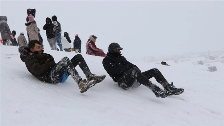 Poşet, tepsi, su bidonu, leğen ve kızaklarla kayan çocuklar ile gençler, çarpışarak küçük kazalar da atlattı.