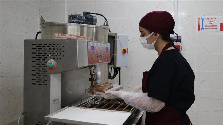 Okulda mart ayında kısıtlı imkanlarla elle üretilen çikolata, Milli Eğitim Bakanlığının destekleriyle kazandırılan atölyede profesyonelce imal ediliyor.