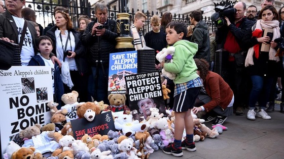 Suriye'nin kuzeyinde şiddetli saldırıların hedefi olan Halep'te gün geçtikçe derinleşen insani kriz, Londra’da Başbakanlık konutu önünde protesto edildi.