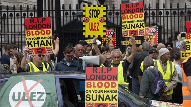 İngiltere Başbakanlık Ofisi 10 Numara’nın bulunduğu Downing Sokağı girişinde bir araya gelen vatandaşlar, emisyon standartlarına uygun olmayan araçlara günlük ödeme yapma zorunluluğu getiren ULEZ uygulamasını protesto etti.