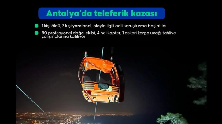 "Antalya'nın Konyaaltı ilçesinde bir teleferik kabininin düşmesi sonucunda bir kişi hayatını kaybetmiş, 10 kişi yaralanmıştır. Kaza sebebiyle 6 ambulans ve 2 UMKE timiyle, toplam 24 kişilik sağlık ekibi görevlendirilmiştir. Yaralılar ilk müdahalelerin ardından hastanelere sevk edilerek tedavilerine başlanmıştır, sağlık durumları ciddiyet arz etmemekte."
