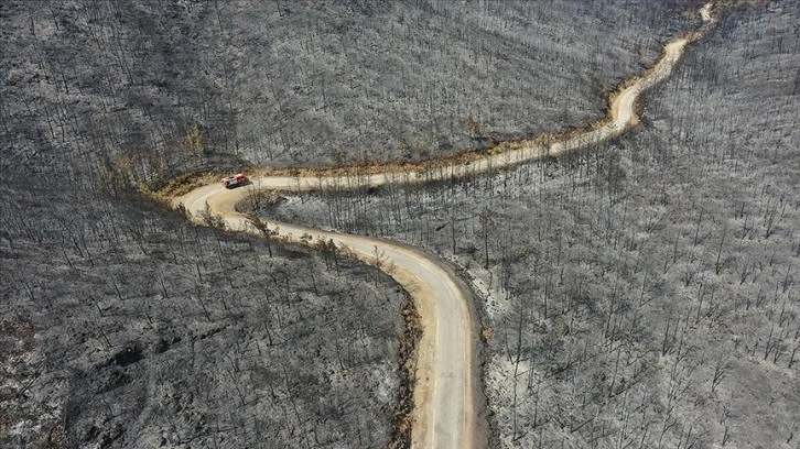 Öte yandan, yangında zarar gören 4 bin 500 hektarlık ormanlık alan ve yapılan soğutma çalışmaları dron ile havadan görüntülendi.