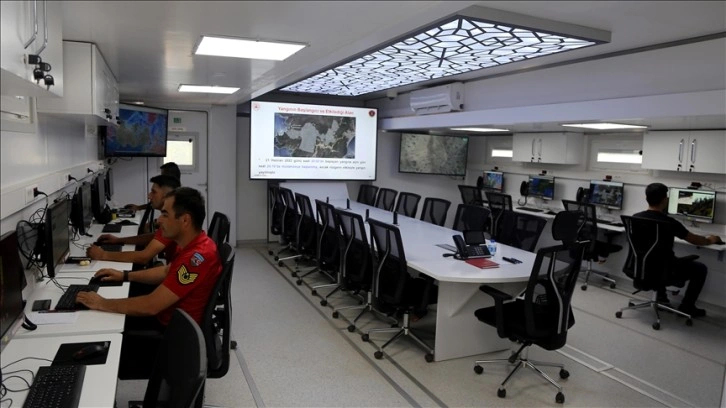 Yangın bölgesinin değerlendirmelerini ve merkeze ulaşan görüntüleri anında canlı yayınlarla söndürme çalışmasına katılan ilgililere aktaran merkezin çalışmalarını, Anadolu Ajansı (AA) ekibi görüntüledi.