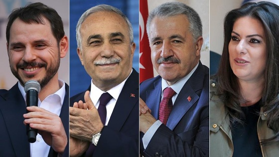 Buna göre, Kalkınma Bakanı Lütfi Elvan Mersin'den, Ulaştırma, Denizcilik ve Haberleşme Bakanı Ahmet Arslan Kars'tan, Enerji ve Tabii Kaynaklar Bakanı Berat Albayrak İstanbul 1. Bölge'den, Çalışma ve Sosyal Güvenlik Bakanı Jülide Sarıeroğlu Adana'dan, Gıda, Tarım ve Hayvancılık Bakanı Ahmet Eşref Fakıbaba Şanlıurfa'dan, Gümrük ve Ticaret Bakanı Bülent Tüfenkci Malatya'dan yeniden milletvekili seçildi.