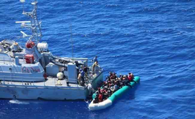 Libya Sahil Güvenlik Komutanlığına durumun bildirilmesinin ardından askeri helikopter ve TCG Gaziantep fırkateyni, düzensiz göçmenleri taşıyan lastik botu yakından takip ederek emniyete aldı.