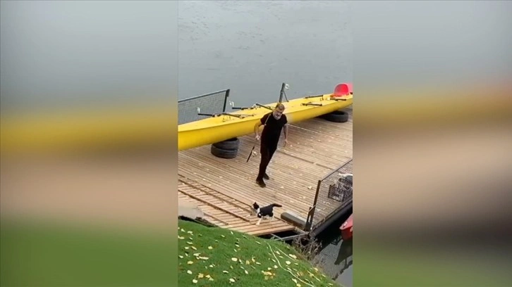 Balığı oltadan çıkarmaya çalışan Kılıç, bir yandan hareket eden balıkla bir yanda da balığı almaya çalışan kediyle mücadele etti.
