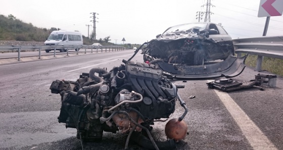 Söke’den Kuşadası yönüne gitmekte olan Volkan İnal yönetimindeki 16 AT 868 plakalı otomobil direksiyon hakimiyetinin kaybedilmesi sonucu kaza yaşadı. Önce yol ortasındaki bariyerlere çarpan otomobil büyük hasar görürken, otomobilin ön kaportasında bulunan tüm teknik aksamı yola savruldu. Kazada motoru bir yere, aküsü bir başka yere dağılan araçtan sürücü Volkan İnal burnu bile kanamadan çıktı.