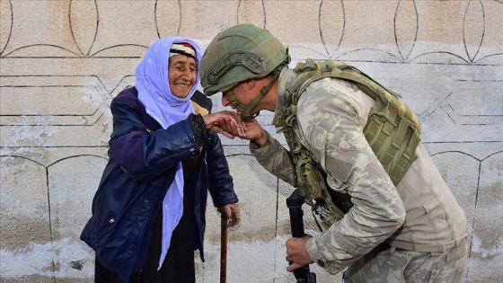 Milli Savunma Bakanlığı, Barış Pınarı Harekatı kapsamında Rasulayn'da bulunan Türk askerinin yaşlı bir kadının elini öptüğü anın fotoğrafını paylaştı.