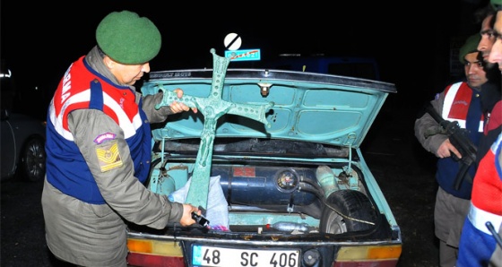 Menteşe-Marmaris karayolu 10. Kilometrede uygulama yapan Menteşe İlçe Jandarma ekipleri 48 SC 456 plakalı aracı durdu. Aracın bagaj bölümünde yapılan aramada çuval içine sarılı vaziyette 77x52,5 ebadında Bronz olduğu değerlendirilen Hz. İsa figürlü Haç obje ve gözyaşı kâsesi ele geçirdi. Araç içinde bulunan H.D. E.Y. A.B. ve M.A. isimli şüpheliler jandarma tarafından gözaltına alındı.