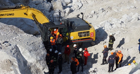 Milas'ın Sarıkaya Mahallesi Yumrutaş mevkiiinde bulunan taş ocağında dün meydana gelen göçükte 4 işçi ve 2 iş makinesi 500 ton ağırlıktaki kayanın altında kalmıştı.