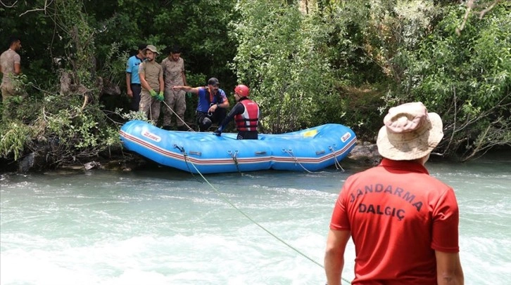Ekipler, Müküs Çayı'nda su debisinin yüksek olması nedeniyle halat bağladıkları rafting botlarıyla zorlu koşullara rağmen özveriyle görev yapıyor.