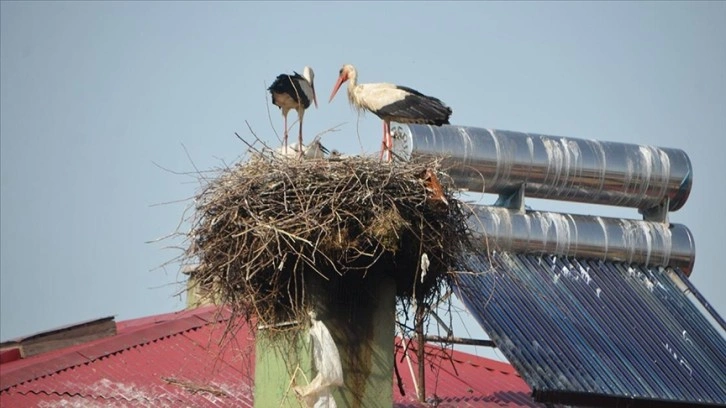 Köyün devamlı misafirleri leylekler, Şükriye Yeşil'e ait evin çatısına bu sene de yuva yaparak kuluçkaya yattı.