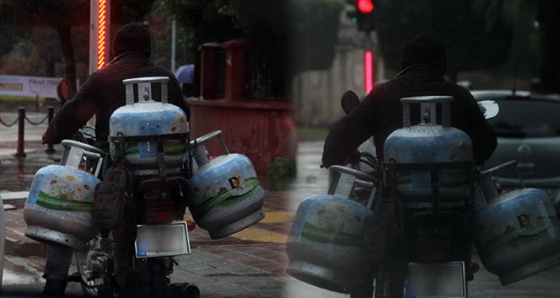 Trafiğin yoğun olduğu Cumhuriyet Caddesinde bir motosikletin arkasında 3 mutfak tüpü taşınması dikkat çekti. Tehlikeli olmasına rağmen tüpgaz bayileri motosikletle evlere servisi yaparken, motosiklet kullanmanın bir türlü önüne geçilemiyor. Bu motosiklet sürücüsü de tehlikeye aldırmadan vatandaşların bakışları arasında trafikte seyretmeye devam etti.
