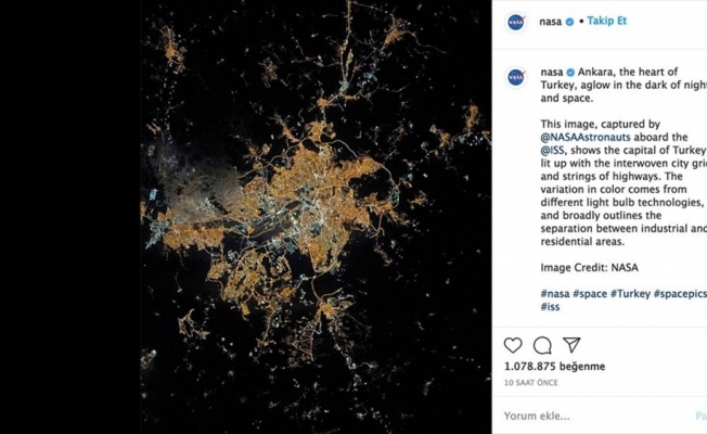 NASA'nın Instagram hesabından yapılan paylaşımda, başkentin gece saatlerinde uzaydan çekilmiş görüntüsü ile "Ankara, Türkiye'nin kalbi, karanlık gece ve uzayda bir parıltı." notu yer aldı.