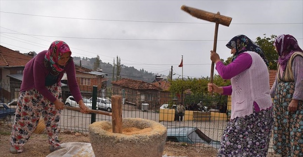 BALIKESİR (AA) - Balıkesir'in Sındırgı ilçesinin kırsal mahallelerinden Kıran'da kadınlar, düğün ve festivallerin vazgeçilmez lezzetlerinden keşkek yemeği için buğdayı dibekte döverek önceden hazırlıyor.