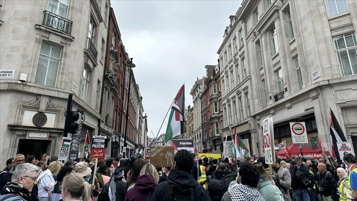 Yaklaşık 250 binden fazla insanın katıldığı yürüyüşte protestocular "Özgür Filistin", "Nehirden denize Filistin özgür olacak" ve "Rishi Sunak saklanamazsın, seni soykırımla yargılayacağız" sloganları attı.