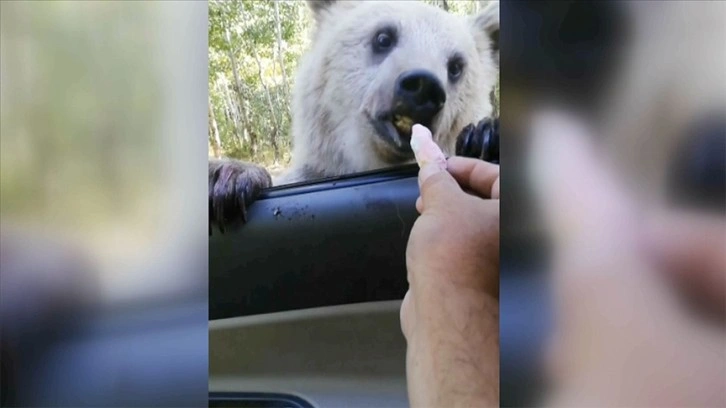 Bitlisli vatandaşlardan Asım Araboğa da Nemrut Krater Gölü'ne giderken aracına yaklaşan bozayıya şeker yedirdi.