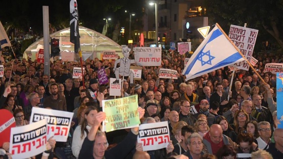 "Netanyahu'yu yolsuzluk davasından kurtarmak" için hazırlandığı eleştirilerine yol açan, polisin üst düzey devlet yöneticileriyle ilgili soruşturmalarda savcılara dava açma tavsiyesinde bulunma yetkisini elinden alan yasa tasarısına karşı öfkelerini dile getiren kalabalık, Netanyahu'nun hapse atılması yönünde taleplerini dile getirdi.
