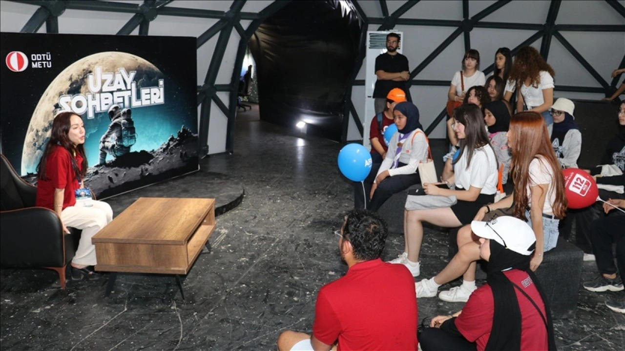 Alanda ODTÜ öğretim üyelerinin katılımıyla ziyaretçilerle "Uzay Sohbetleri" yapılıyor.