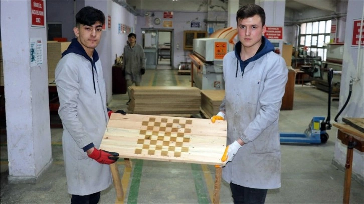 Karabük Mesleki ve Teknik Anadolu Lisesi öğrencileri, onarılan okullarının çatısından çıkan atık ahşapları satranç sehpasına dönüştürüyor.