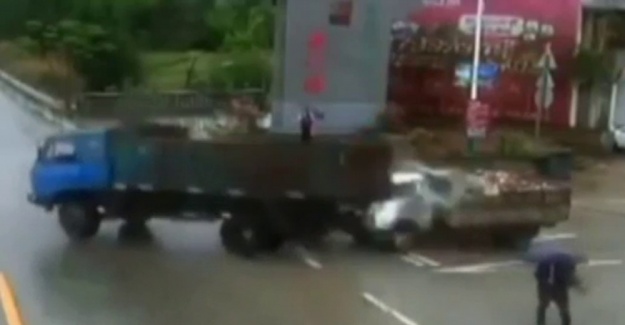 İnanılmaz olay Çin’de gerçekleşti. Yaşlı adam yolun karşısına geçiyordu. Yol da ıslaktı. Bu sırada gelen kamyon ıslak zeminin de etkisiyle kaydı. Yaşlı adamı teğet geçerek kavşakta duran kamyonete çarptı. Ölümden dönen şanslı adam, dona kaldı. Araçlarda hasar oluşurken, o anlar da güvenlik kamerasına böyle yansıdı.
