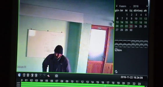 Caminin güvenlik kameralarında ise; hırsızın camiye girişi yer alıyor. Daha sonra kabloyu kesen hırsızın yardım kasasının bulunduğu alana gitmesi ve bir süre sonra da camiden ayrılması kameralara takılıyor.