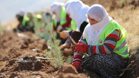 İş makineleriyle kazılan yamaçlara bir yandan fidan diken kadın işçiler, bir yandan da ormanların korunması ve geliştirilmesi için mesai harcıyor.