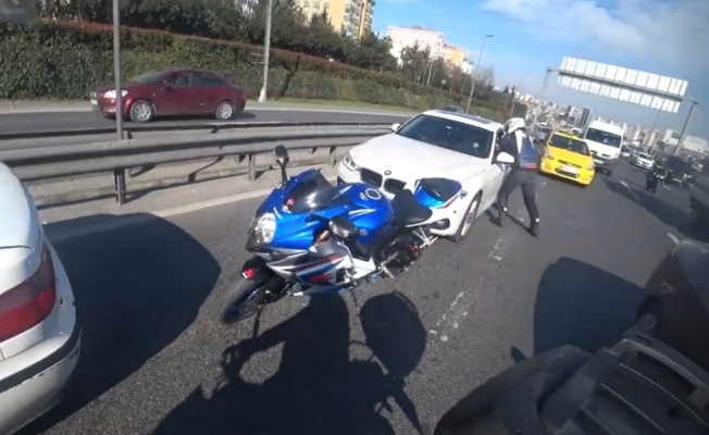 Bir süre sonra araç sürücüsü motosikletli ile konuşmaya çalıştıysa da başarılı olamadı. Tüm bu yaşananlar ise kask kamerasına saniye saniye yansıdı.