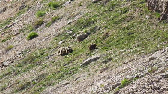Vadide karların erimesiyle kayalıklar arasında büyüyen otlarla karnını doyurmaya çalışan ayılar, izlendiklerini fark edince zirveye doğru tırmandı.