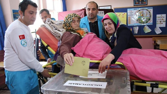 Görevliler bu çerçevede ilin Mimar Sinan Mahallesi'nde oturan ve oy kullanmak için kendilerinden yardım isteyen felçli hasta Fatma Canpolat'ı (76) evinden sedye ile alıp ambulansla Salih Erkan İlkokuluna götürdü.