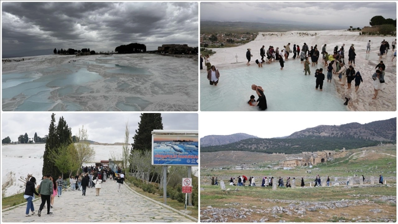 Çoğunluğu yerli misafirler, beyaz travertenler üzerinde yürüyüp hatıra fotoğrafı çekti. Ören yerindeki antik kenti de gezen tatilciler, zaman zaman etkili olan yağışa rağmen giriş kapılarında kuyruk oluşturdu.