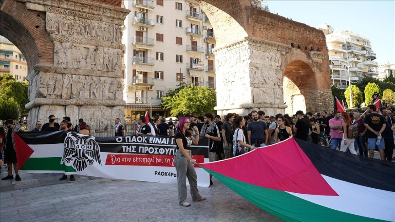 PAOK taraftarları İsrail takımlarının spor etkinliklerine katılmasını protesto ettiBugün saat 19.45'te Toumba Stadı'nda oynanacak maç öncesi PAOK taraftarları, İsrail takımlarının spor etkinliklerine katılmasını protesto etti ve Filistin'e destek verdi.