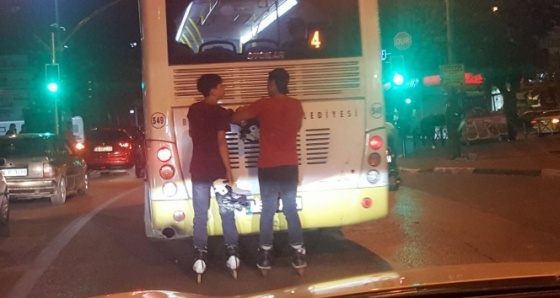 Saatte yaklaşık 70 kilometre hızla giden ve şoförünün arka tarafı göremediği halk otobüsüne tutunarak paten kayan gençler, diğer sürücülerin uyarılarına da kulak asmadı.