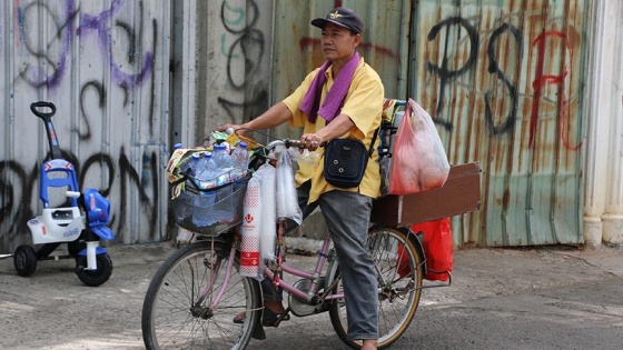 Endonezya'nın başkenti Cakarta'da yaşayan 50 yaşındaki bisikletli çaycı Yossi Sanusi, ekmeğini pedal çevirerek kazanıyor.