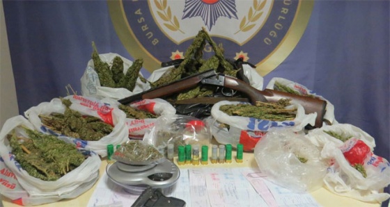 Edinilen bilgiye göre, Bursa İl Emniyet Müdürlüğü Uyuşturucu ile Mücadele Şube Müdürlüğü ekipleri, S.Y. isimli kişinin Yıldırım ilçesinde ikamet eden N.Ö. isimli kişiye yüklü miktarda uyuşturucu getirdiği bilgisine ulaşınca harekete geçti. N.Ö.'nün evinde yapılan aramada 5 kilo 314 gram esrar, 1 adet tabanca, 1 adet hassas terazi, uyuşturucu ticaretinden elde edildiği tahmin edilen 14 bin 410 lira para ve 504 Amerikan Doları, S.Y. isimli kişinin iş yerinde yapılan aramada ise 338 gram esrar ile 1 adet av tüfeği ele geçirildi.