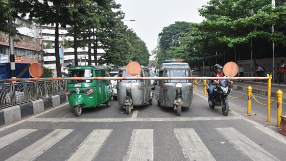 Alışılagelmişin dışında bir trafik akışı olan Dakka'da nizam, trafik polislerinin yanı sıra kaldırılıp indirilebilen trafik lambalarıyla sağlanmaya çalışıyor.