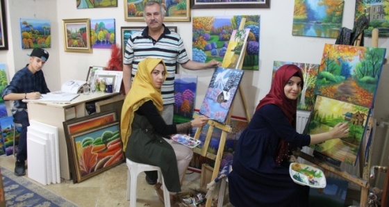 Kara, Kütahya Belediyesi Kent Konseyi Sanat Merkezi'nde lise öğrencileri Ayşe Zeyad, (18) Nur Kasım (18) ve Ömer Zeyad'a (15) haftanın 3 günü yağlı boya tablo yapma kursu veriyor.