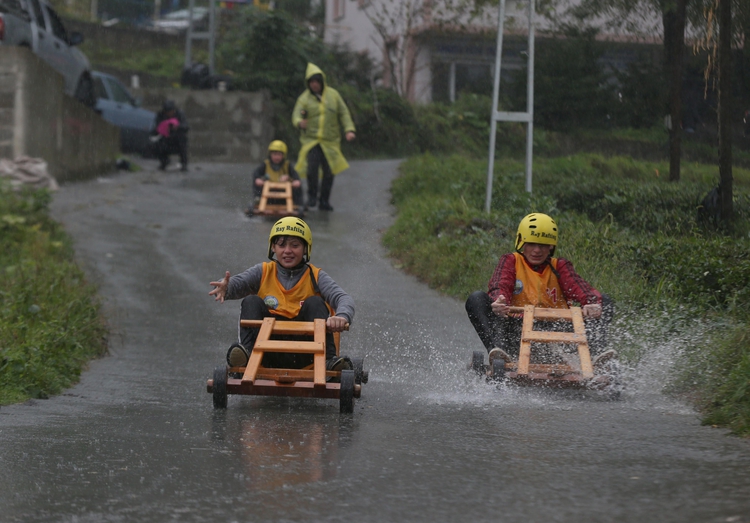 Olası kazalara karşı güvenlik önlemleri alınan yarış pistinin tehlikeli bölümlerine saman balyaları yerleştirildi. Yağışlı havada zor anlar yaşayan bazı yarışmacıların, tahta arabalarını iterek bitiş çizgisine ulaşmaya çalıştıkları görüldü.