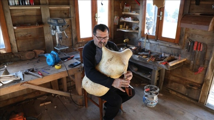 Serin, keçi derisi ve şimşir kullanarak el işçiliğiyle yaptığı tulumu yaklaşık bir ayda tamamlarken yurt içinin yanı sıra yurt dışına da tulum satıyor.