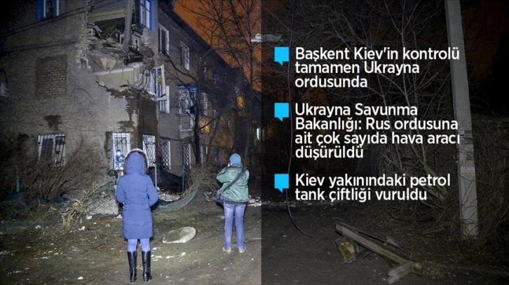 Rus güçleri Kiev'e yaklaşsa da şehri ele geçirmeyi hala başaramadı. Gece boyu sık sık patlama seslerinin duyulduğu Kiev'de zaman zaman şehir merkezinden silah sesleri de geldi.