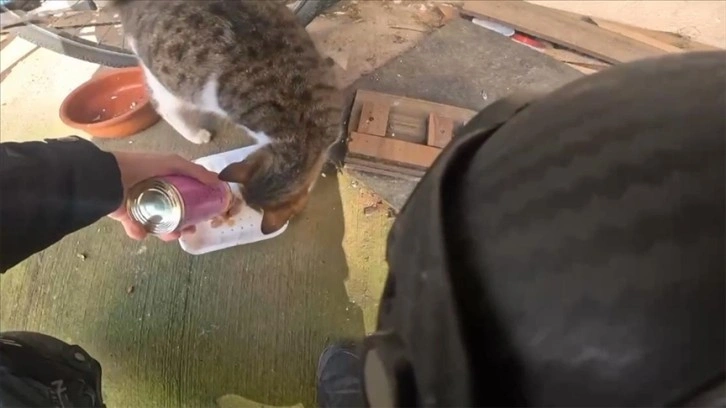 Kediyi apartman önünde bulan Kömürcü, mamayı kaba dökerek hayvanın yemesini sağladı. Kediyi bir süre sevdikten sonra adresten ayrılan Kömürcü, kask kamerası görüntülerini sosyal medya hesabından paylaşınca büyük beğeni topladı.