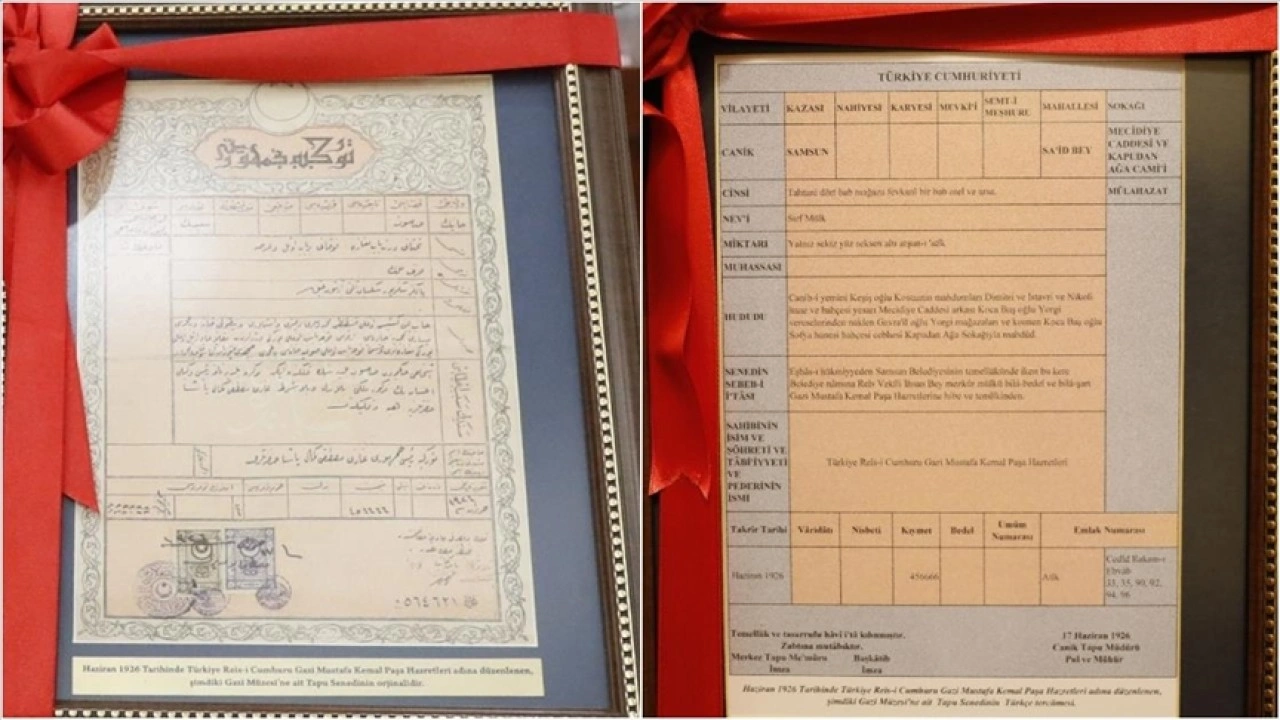 Tapu ve Kadastro 10. Bölge Müdürlüğünde görevliler, arşiv belgelerinin dijitale aktarımı çalışmaları sırasında Osmanlıca yazılı, "Türkiye Reisi Cumhuru Gazi Mustafa Kemal Paşa" adına Samsun'da bugün Gazi Müzesi olarak kullanılan binanın tapu senedini buldu.