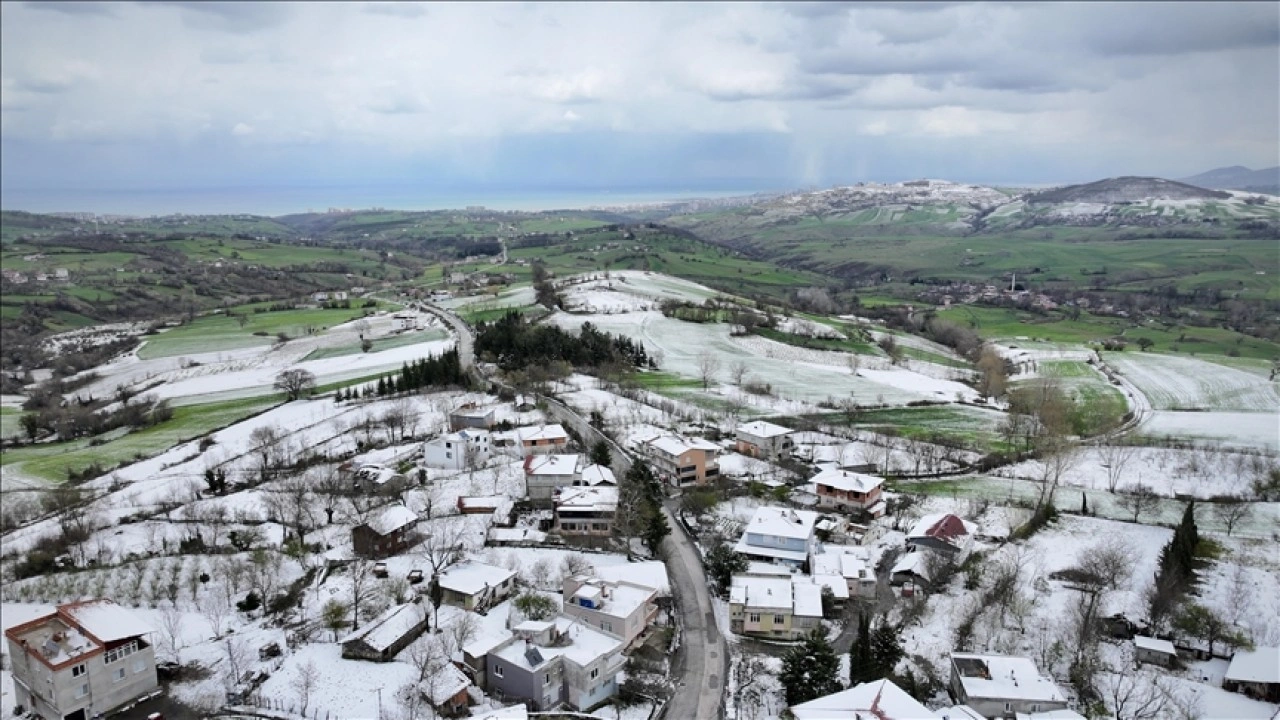 Kar yağışının ardından yüksek kesimleri beyaza bürünen, etekleri yeşil kalan Kocadağ Yaylası'nın manzarası dronla görüntülendi.