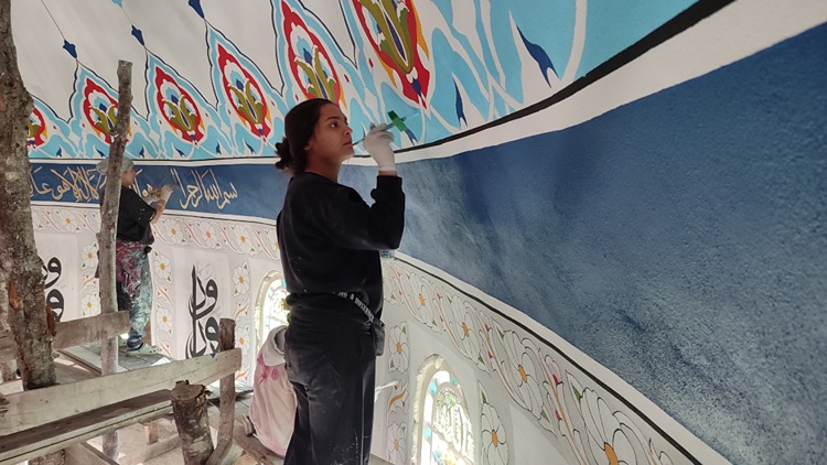Kurdukları ahşap merdivenle iskeleye çıkan kadın nakkaşlar, metrelerce yükseklikte camilerin tavanları ve duvarlarına ince fırça darbeleriyle motifler yaparak sanatlarını icra ediyor.