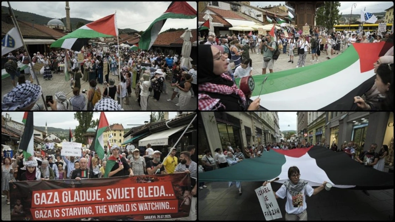 Saraybosna'daki Başçarşı Meydanı'nda toplanan grup, Saraybosna Çocukları Anıtı'na yürüyerek Filistin ile dayanışma mesajı verdi.