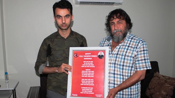 Osmaniye'de, çocukluk arkadaşı Şehit Uzman Çavuş Veli Demiryürek'in anısına şiir yazıp besteleyen müzisyen Hanifi Gökhan, üzerinde şiirin ve şehit arkadaşının fotoğrafının bulunduğu tabloyu şehidin ailesine hediye etti.